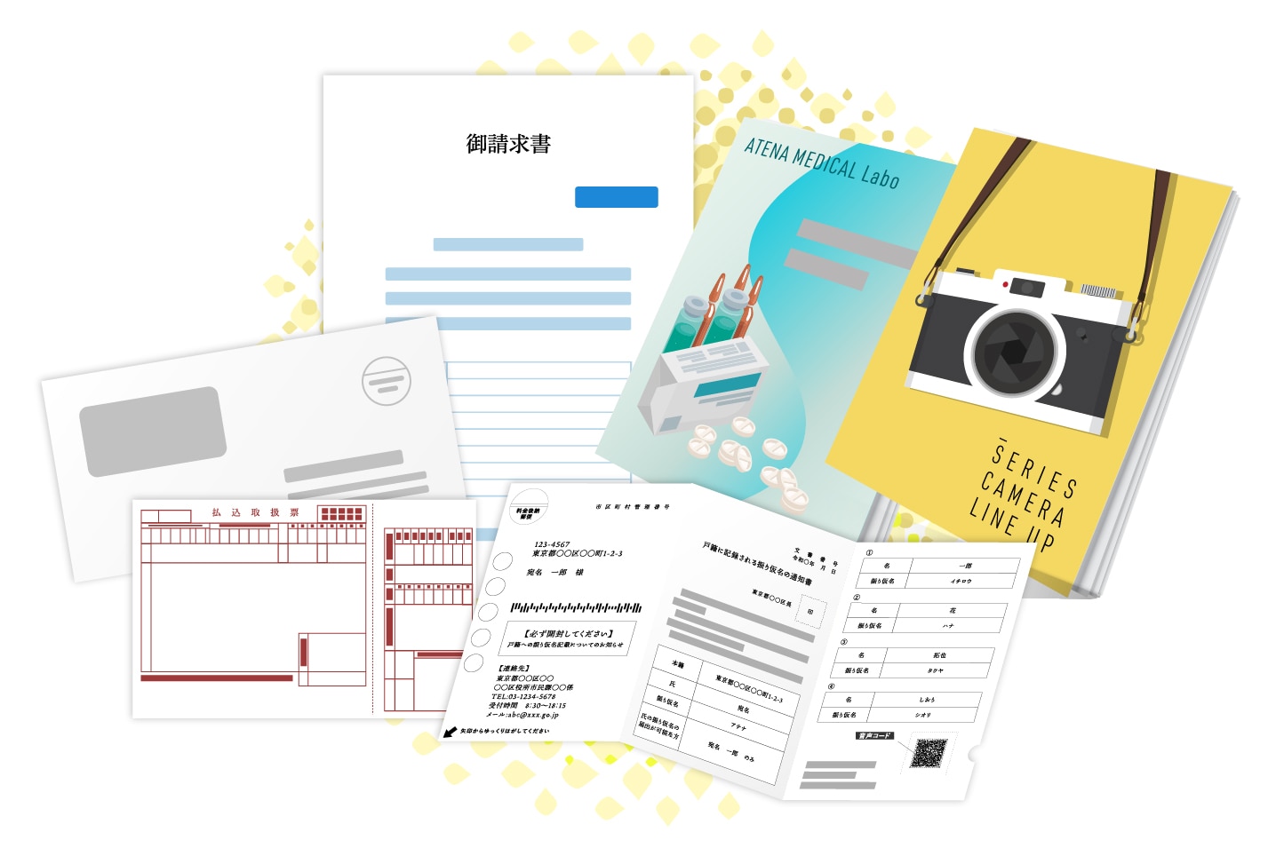 クレジットカードご利用明細・請求書・振込用紙付き宛名台紙・控除証明書・督促状・払い込み用紙・保険設計書・生命保険個別設計書