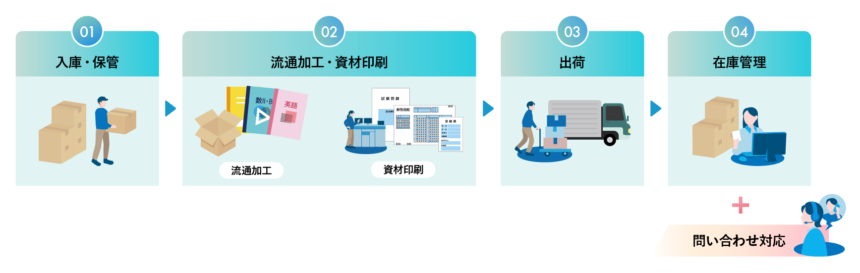 学習塾や検定試験など、学習コンテンツの保管からセット組み・全国発送・問い合わせ対応までワンストップでご支援します。
